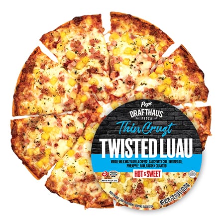 A classic Hawaiian pizza with a tasty twist! This crowd-pleasing recipe starts with Pep’s sauce and real Wisconsin shredded mozzarella cheese. We add just the right amount of sweet pineapple, plenty of savory ham and bacon, and a dash of spicy, chili-infused oil. Salty, cheesy, and enough sweet heat to get your luau started!